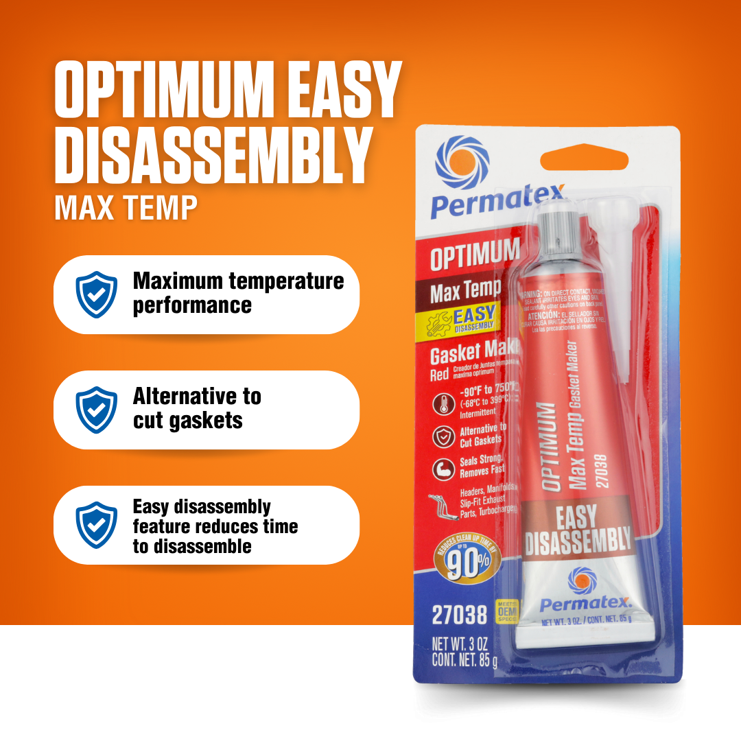 Permatex Optimum Easy-Disassembly Gasket Makers reduces the time it takes to disassemble the engine or parts. Apply Optimum Easy Disassembly as normal and when it comes time to take apart, all you have to do is loosen the parts from each other and peel away the gasket maker with your fingers. It’s that easy!